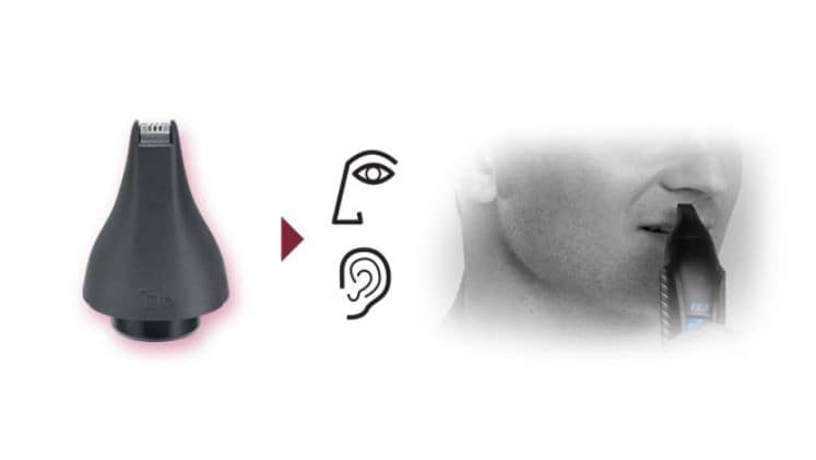 Το γραμμικό trimmer (NEE) επιτρέπει ασφαλές και ακριβές τριμάρισμα στις πιο δύσκολες περιοχές, όπως η μύτη, τα αυτιά και τα φρύδια.