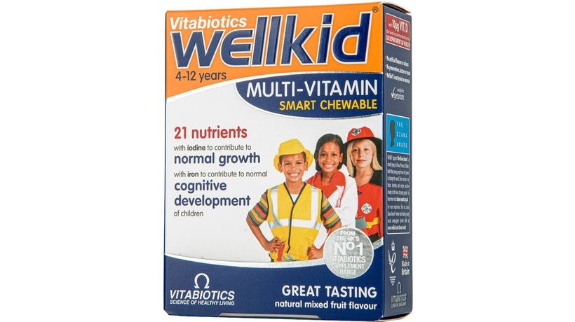 Το συμπλήρωμα διατροφής Wellkid Multi Vitamin της Vitabiotics περιλαμβάνει μασώμενες ταμπλέτες που έχουν σχεδιαστεί ειδικά για παιδιά στην ανάπτυξη, ηλικίας 4-12 ετών. Κάθε ταμπλέτα παρέχει εύρος 21 απαραίτητων συστατικών, όπως βιταμινών Α, B, C, D, E και σημαντικών μετάλλων όπως μαγνήσιο, σίδηρο και ψευδάργυρο, σε περιεκτικότητες κατάλληλες για παιδιά. Επιπλέον, περιέχει φυσική πηγή ωμέγα-3 λιπαρών οξέων από λιναρόσπορο.