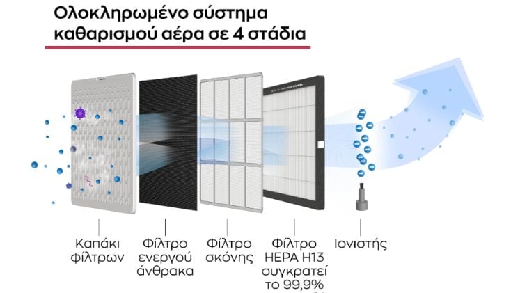 Ο αέρας σου φιλτράρεται μέσα από τέσσερα στάδια φιλτραρίσματος, απομακρύνοντας ρύπους, οσμές και αλλεργιογόνα. Έτσι, εξασφαλίζεις ένα υγιεινό και ευχάριστο περιβάλλον για σένα και την οικογένειά σου.