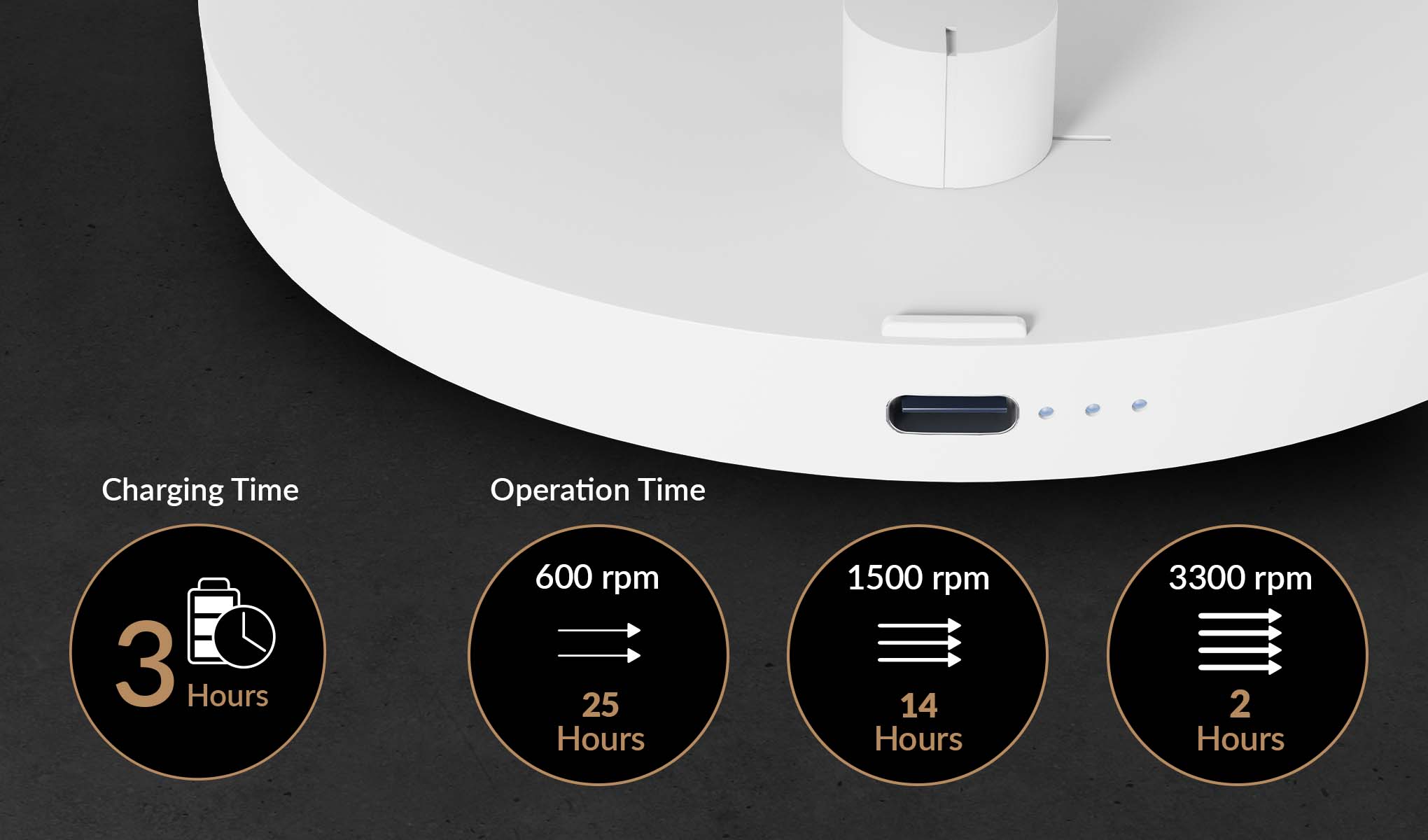 Σε κανονική λειτουργία με περίπου 1500 στροφές ανά λεπτό, ο χρόνος λειτουργίας είναι 14 ώρες, σε πλήρεις 3300 στροφές ανά λεπτό 2 ώρες. Μέσα σε 3 ώρες, μπορείς να φορτίσεις το Summair Plus χρησιμοποιώντας το παρεχόμενο καλώδιο φόρτισης USB-C σε USB-A μήκους 1,2 μέτρων και να το λειτουργήσεις για έως και 25 ώρες στη χαμηλότερη ταχύτητα. Κατά τη διάρκεια της φόρτισης, μπορεί επίσης να λειτουργήσει μέσω καλωδίου USB.