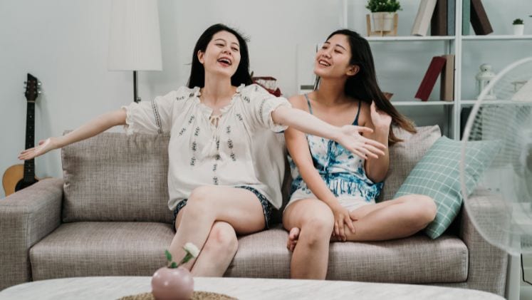 Δεν υπάρχει τίποτα καλύτερο από το να μοιράζεσαι στιγμές χαλάρωσης με φίλους, ακόμα και στις πιο ζεστές μέρες. Με έναν ανεμιστήρα που γεμίζει τον χώρο με δροσιά, η ατμόσφαιρα γίνεται ανάλαφρη και ευχάριστη. Η εικόνα μάς δείχνει πως η άνεση στο σπίτι μπορεί να είναι απλή υπόθεση: λίγη δροσιά, μια παρέα που αγαπάς και χαμόγελα που γεμίζουν τον χώρο.