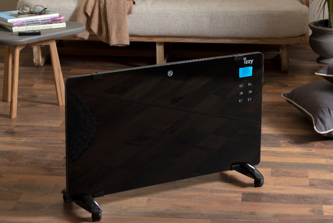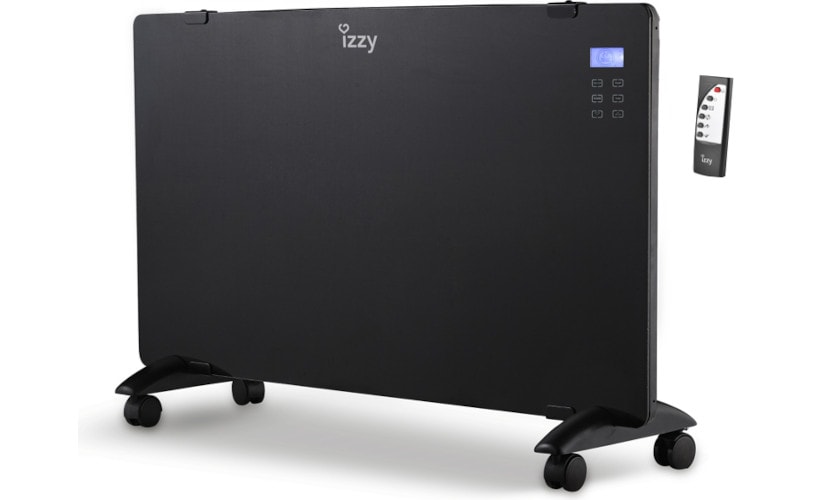 O θερμοπομπός-convector Izzy IP24 IZ-9017 ταχείας θέρμανσης, με τηλεχειριστήριο μεγάλης εμβέλειας, 2 σε 1: δωματίου και μπάνιου, και με 2 βαθμίδες θέρμανσης 1100W-2200W, είναι κατασκευασμένος από γυαλί ασφαλείας.