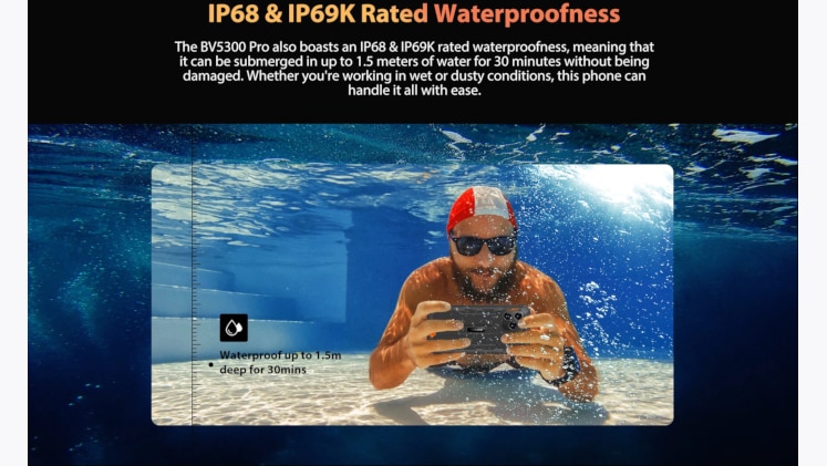 Το BV5300 Pro διαθέτει πιστοποιήσεις IP68 και IP69K, προσφέροντάς σου πλήρη προστασία από σκόνη και νερό. Μπορεί να βυθιστεί σε βάθος έως 1.5 μέτρο για 30 λεπτά χωρίς πρόβλημα. Επιπλέον, η λειτουργία υποβρύχιας κάμερας σου επιτρέπει να τραβάς φωτογραφίες και βίντεο κάτω από το νερό, διατηρώντας τις αναμνήσεις σου ζωντανές ακόμα και σε υγρό περιβάλλον.