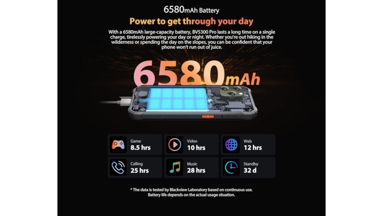 Το BV5300 Pro διαθέτει μπαταρία χωρητικότητας 6.580 mAh, προσφέροντάς σου εκτεταμένη αυτονομία για τις καθημερινές σου ανάγκες. Με διάρκεια αναμονής έως και 768 ώρες και έως 27 ώρες συνεχούς ομιλίας, μπορείς να επικοινωνείς και να χρησιμοποιείς τις εφαρμογές σου χωρίς άγχος για τη φόρτιση.