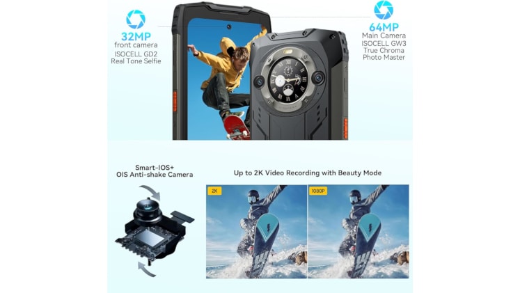 Η κάμερα του BV9300 Pro προσφέρει εκπληκτικές δυνατότητες φωτογραφίας με τον αισθητήρα 64MP Samsung ISOCELL GW3 στο πίσω μέρος, που εξασφαλίζει φωτεινές και ευκρινείς εικόνες σε όλες τις συνθήκες φωτισμού. Με Tetrapixel τεχνολογία και Smart-ISO, απολαμβάνεις εικόνες με υψηλή πιστότητα χρωμάτων και εντυπωσιακή ευαισθησία στο φως. Η 32MP Selfie Camera με ISOCELL GD2 αισθητήρα και Face Fill Light σου επιτρέπει να τραβάς υπέροχες φωτογραφίες ακόμη και σε χαμηλό φωτισμό. Με δυνατότητα 2K βίντεο, η εμπειρία σου φτάνει σε νέα επίπεδα ποιότητας εικόνας και ήχου, ενώ οι λειτουργίες Ultra-wide, Ultra-macro και Portrait σε βοηθούν να εξερευνήσεις νέες δυνατότητες στη φωτογραφία.