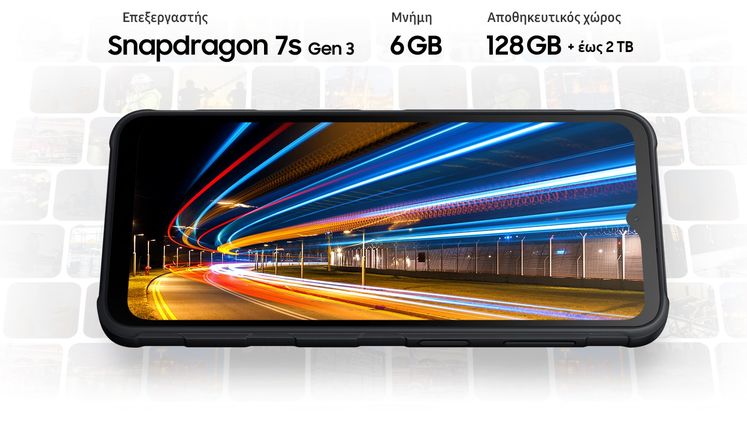 Μεγιστοποίησε την εργασιακή σου απόδοση με το Galaxy XCover7 Pro και τον επεξεργαστή Snapdragon 7s Gen 3 με 6 GB RAM. Ο εσωτερικός αποθηκευτικός χώρος παρέχει 128 GB για όλα τα επαγγελματικά σου αρχεία, τις φωτογραφίες και τα βίντεο, ενώ μπορείς να προσθέσεις έως 2 TB επιπλέον με μια κάρτα microSD.