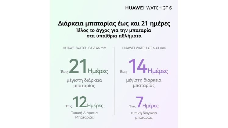 Η μπαταρία του HUAWEI Watch GT 6 προσφέρει έως 21 ημέρες αυτονομίας στην έκδοση των 46mm και έως 14 ημέρες στην έκδοση των 41mm, ανάλογα με τη χρήση. Με ενεργοποιημένο Always-On-Display η αυτονομία φτάνει αντίστοιχα έως 7 και 5 ημέρες. Ο νέος πυρήνας υψηλής περιεκτικότητας σε πυρίτιο αυξάνει την ενεργειακή πυκνότητα κατά 37%, κάνοντας το ρολόι τον απόλυτο «βασιλιά της αυτονομίας». Με έως 40 ώρες σε λειτουργία εξωτερικού GPS, το ταξίδι σου συνεχίζεται χωρίς άγχος.