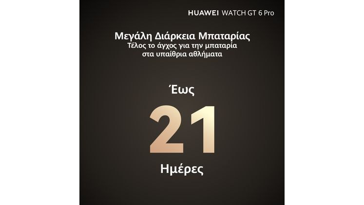 Το Huawei Watch GT 6 Pro διαθέτει κορυφαία μπαταρία που προσφέρει έως 21 ημέρες χρήσης με μία φόρτιση. Με την καινοτόμα τεχνολογία υψηλής περιεκτικότητας σε πυρίτιο, η ενεργειακή πυκνότητα αυξάνεται κατά 37%, δίνοντάς σου ακόμα μεγαλύτερη αξιοπιστία. Σε τυπική χρήση αντέχει έως 12 ημέρες, ενώ με ενεργοποιημένο το Always-On Display προσφέρει έως και 7 ημέρες αυτονομίας. Για πιο απαιτητικές συνθήκες, διαθέτει έως 40 ώρες συνεχούς λειτουργίας GPS, ώστε να είσαι πάντα έτοιμος να κατακτήσεις νέους στόχους χωρίς άγχος για τη φόρτιση.